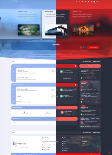 peacock Theme is an advanced Skin for Invision website. with numerous options, Admin has a wide range of choices from top to bottom in case of style, colors, and functionality. Key Features: Light and Dark mode + Customizable color palette Can be set which one is default (Light or Dark mode) Admin setting for changing colors (Light and Dark mode) User-level options for choosing between modes 8 different color options for the color palette Admin side settings for fully customized color palette (from colors to their names) Can be set which color is default and which can be selected by users User-level options for choosing between colors Admin can select a default combination (for example Dark mode + Custom color 3 (can be green)) and make it permanent as well. Header Dynamic Cover Peacock Theme uses a special header area designed to display an image as a cover photo. It comes with a default cover photo but can be changed with other images with settings. The header cover photo also comes with a series of settings to make it dynamic. with header dynamic cover options, the top header area of the peacock theme will pick up a designated image from the visiting page. users will see different cover photos based on where they are. Example for Topics: every topic can have its own header cover image. Dynamic Header Cover option picks up the first image uploaded in a topic. For this option to work there should be at least one image directly uploaded to topics, files, events ... and pages that support Dynamic Header Cover. Currently supports Topics (as of now uses only images that are directly uploaded to a topic, as ver 1.2.1 it will use linked and embedded images in the topic as well) (Demo1,2,3), Forums (using images that are being uploaded for forum for grid view), Files in Download app (using the image that selected as the primary image in file view), Gallery (Album (in-album image can be set by owner)/Category (in-category image can be set by moderator), Clubs (using image that set for club cover photo), Events (using the image that set for event cover photo). Two Different Modes for Main Navigation Main navigation in desktop view has two different modes to choose from by Admin. Style 1 is the default view of all navigation and sub-navigation links Navigation with menu items will open in a vertical menu using fontIcons for navigation links with the ability to re-arrange and customize icons via settings Style 2 for main navigation on the desktop consists of two separate parts: Main Navigation links can be displayed with a Hamburger menu at the side. all links created with the menu manager will display in a sidebar area when the user clicks on the hamburger icon. The Sidebar area has its own customization options for color schemes. Sidebar area links will be highlighted by selected color based on the user visiting the page The area in front of the hamburger icon is now reserved for custom links and can be used in all sorts of ways, like making a list for Trending, Hot links, and ... with customization options Custom Links for Trending, Hot links ... can be displayed in two modes: all in line in front of the hamburger icon or all links can be contained in one drop-down menu Custom Links created here can be imported to "Mobile Menu" with the setting Dynamic Page Details Dynamic Page Details is an optional feature when sticky navigation is active. with this option are active, when users navigate on any page, sticky navigation at the top will display a handful of details. Page Name, Buttons like Share, Follow, Reply, Manage (for Admin/Moderators) Header Content Slider and Page Title Box Header content slider can be displayed at the top of the page, with up to 6 contextual slides with image, description, and title Can be linked to other pages or used as promotional items on their own Can work as a slideshow/auto-play Page title box is an ordinary Invision title box for all pages, only with the option to display at the top of the page and over the header's cover image in the desktop view Page title box positioned on the top cover area has its own three styles (Dark/Light/Pick from color palette) Per Forum Color design When Alternative Design Mode is active for Topics and Forums, the normally selected color in the color palette will be used in styling. however, if a forum has its own 'Feature color' from forum settings, the peacock theme will override the normal color scheme with feature color so the forum listing uses those colors. Display Topic Thumbnail Image in topic listing Browsing in topic listing looks different in the peacock theme when the "Display topic image" setting is active. similar to Dynamic Header Cover, images in the topic listing will be picked from the first uploaded image in respected topics. from ver 1.2.1 forward, the thumbnail will be picked from every type of image that exists in the topic. 4 Different Options for Post Styles Admin can choose the theme of topic posts from 4 different styles. Custom Design for User Hover Cards Admin can choose the theme of Hover Cards from 3 different styles Alternative Design for Widgets With admin options, Many default IPS widgets can have an Alternative style with Grid style and support for background image Support for Feed widgets: Topics, Files, Events, Our Picks Special Search Navigation Special navigation for search in Desktop/Tablet/Phone View Admin ability to create suggested links for users when search navigation opens Advanced Popup messages Advanced popup message is a tool to create simple/complex/multi-page popup message boxes and display them to guests or separately for registered users Admin can create two different popup messages to target guests and registered users (can choose which group as well) Popup message continue to be displayed until the user dismiss it Admin can create a permanent link to popup messages in selected areas like at the end of breadcrumb or in the user menu. by clicking on this link, the created popup will 