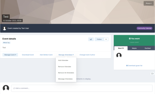 This resource will add new features to the Calendar, such as: The user will receive a notification about the event he has RSVPed in the event date Manage RSVP Attendees Add or Remove Attendees Change event author Swap Reviews & Comments tabs position in event view Add settings to control: Number of comments per page Number of reviews per page Add a new tab in the member profile to display all events RSVPed by the member -
