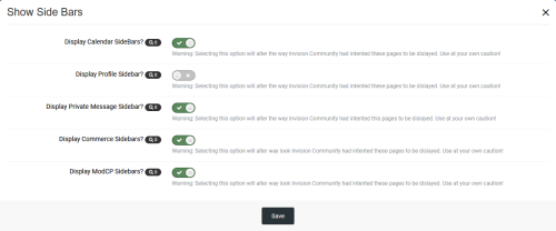 IPS decided in their wisdom to remove sidebars within some areas of the Community Suite. This will allow you to use sidebars with all applications, such as Calendar, CMS, ModCP, Contact, Members Profile, Messenger, Search, etc. This will also prevent any Layout changes that IPS forces on your Community Suite. The following pages will have a full layout: Contact, Cookies, Guidelines, LostPass, Privacy, Register, Settings, Term, etc. -