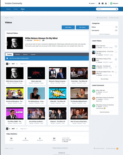 Allows your members to submit their own videos for community viewing. Support is included for all the major video sites. Features NEW Per category custom field support. NEW Quick add video support. NEW Video.JS support for uploaded videos. NEW Improved front end design new trending, followed, discover and featured tabs .Including pagination and sorting. NEW RSS import support for videos. Support included for share links on view video page. Support for category permissions. Set who can add videos, edit videos, delete videos, add comments, edit comments, delete comments per group. Support for per category settings, including view category, view and add video permissions and discussion topics. Ajax rating system with per group permissions who can rate and even who can change their votes. Default per category settings for sort and filter as well as number of videos per page. Support for YouTube thumbnails. Thumbnails are downloaded and saved locally for display next to videos when new videos are added using media urls. (See below for which sites are supported.) Quick add video option, enter the media url and category and the system will attempt to get the video title/description automatically. (Not all media urls supported.) Support for category or video following. Support for IPB's tag class for videos. Per category or globally created discussion topics. RSS feed for new videos added and per category rss feed export added for each category. -