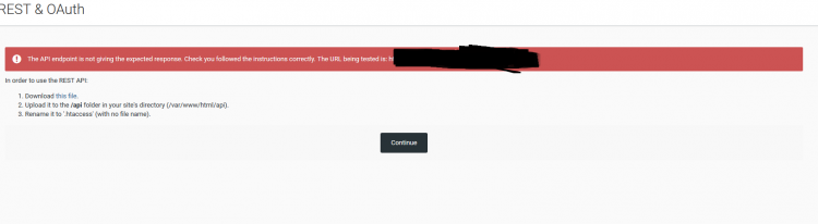 The API endpoint is not giving the expected response. Check you followed the instructions correctly. The URL being tested is: https://testdomainblablabla/api/index.php?/core/hello
