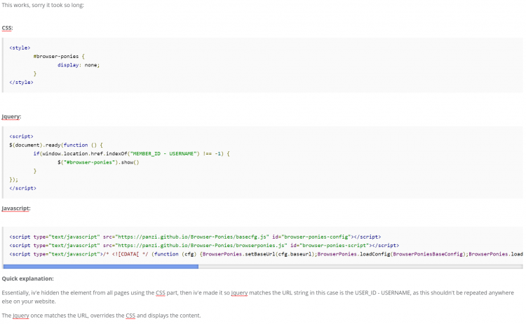 10. This will display only when phrase / word is in URL, so set it to the members URL like mine below: if(window.location.href.indexOf("1-titan") !== -1) { JAVASCRIPT } This will display based on member group: {{if \ IPS \ Member :: loggedIn () -> member_group_id === ID}} your code {{endif}} This will display based on member: {{if \ IPS \ Member :: loggedIn () -> member_id === ID}} your code {{endif}}