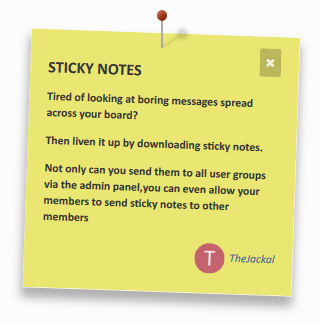 About This File This application will allow you, or if you have selected members, To post global sticky notes to other members on your board SPECIAL BLACK FRIDAY SALE 25% OFF NORMALLY $17.50 DEMO Global Sticky Notes ( ACP ) Display up to 10 admin based global sticky notes to your members Choose what user groups can see the sticky notes Add a signature (username and avatar) to the bottom of each sticky note allowing members to see who wrote it, as a clickable link to said profile Choose the colour of the sticky notes Choose from 9 different positions to show each individual sticky note Set a expiry time and date for each sticky note with a option to just show it until the user dismisses it Global Sticky Notes Front End Admin The admin/s can send the global sticky notes from the front end via the create menu ( Only admins can use this feature ) Personal Sticky Notes ( MEMBERS ) Allow chosen user groups to send personal sticky notes to other members Members can receive a unlimited amount of sticky notes All sticky notes are dismissable All personal sticky notes will automatically add the username and avatar, unless you have selected in the ACP to allow anonymous sticky notes (read ACP Menu below) Personal sticky notes will display the time the note was sent to the member for example "just now", " 5 minutes ago", "4 hours ago", "16th July" and so on Members can either send personal sticky notes to members by their hover card or via their forums topics and you can also send them via the users create menu Each ( Non anonymous ) personal sticky note has a reply icon on allowing users to easily reply to other members notes Front End ( PERSONAL STICKY NOTES ) Added a link to the users drop down menu linking to the new tables listed below Shows a table listing all the members received sticky notes with the ability to restore the note bringing it back to life Shows a table listing all the members sent sticky notes with the ability to edit and resend or just resend the stickynote, it also shows if the user has dismissed the sticky note Members can view all their sent and received sticky notes between them and X member All tables can be sorted by time and date and also have a advanced search for members or a time and date stamp Widgets Show a widget with a list of members who have sent the most sticky notes Show a widget with a list of members who have received the most sticky notes ACP Menu Sticky Notes (Global including personal) Choose to use either a pin or a bit of sticky tape to hold the sticky note Choose to show or hide sticky notes on mobile or tablet devices Personal Sticky Notes Allow members to send anonymous sticky notes to other members (admin can view all sticky notes in the ACP read below) Read all the sticky notes send by members in a nice and tidy table and you (being the admin) can even view the sender if they sent it anoymous Select what member groups can use personal sticky notes Choose from 9 different positions to place the sticky notes Mass delete sticky notes by either "ALL", "READ", "UNREAD", by individual members or by chosen user groups Choose the colour of personal sticky notes Member Group ACP Menu Choose how many personal sticky notes each member group can send per day, with a unlimited option Members Settings ACP Menu Block individual members from using personal sticky notes Block individual members from receiving sticky notes How to install If you have version 1.0.3 or below installed, uninstall it as it's a plugin and will conflict with the new application Go to your ACP and applications then click to install and upload the downloaded .tar file What's New in Version 2.1.0 See changelog Released November 25 New Features Members can now block other members from sending them personal sticky notes via their profile setting page Added the ability for members to mass dismiss personal sticky notes ( This can be turned on or off in the ACP settings of the personal sticky notes ) Added the ability to hide the ' send sticky note ' link on the members topic posts via the ACP settings of the personal sticky notes Added a little note count bubble to the dismiss button on personal sticky notes showing the amount of notes they have got to dismiss ( This will only show if there is more than 1 )- 1 review