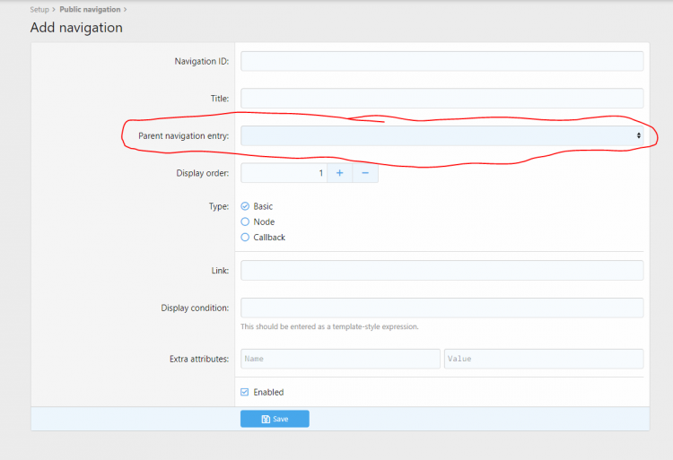 1. Go to the admin panel. Setup -> Navigation -> Public Navigation Press on the upper right "Add navigation". Place your settings and don't forget to chose your parent navigation entry.