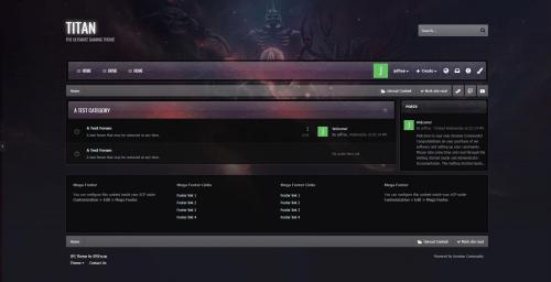 Titan is the ultimate gaming theme, based upon a large wallpaper image which is blurred behind textured navigation and category bars. Easily upload your own image via the theme settings to completely change the colour scheme, or let your members choose from a predefined selection!