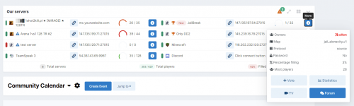 Server table showing server information about the status, name, number of players, current map and their owners as applications on IPS Community Suite.