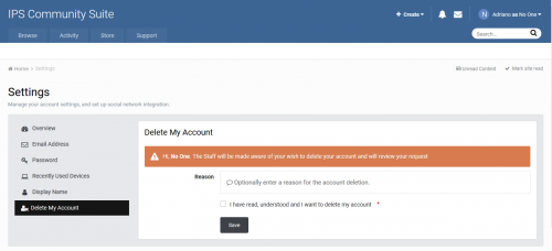 This application will allow users from specific user groups to request to delete their account. All requests will be reviewed by Staff (admins), directly on ModeratorCP -> Delete Account Requests, to approve or deny the request. The whole user content (topics, posts, attachments, polls, etc.) will be preserved; only the account will be deleted.