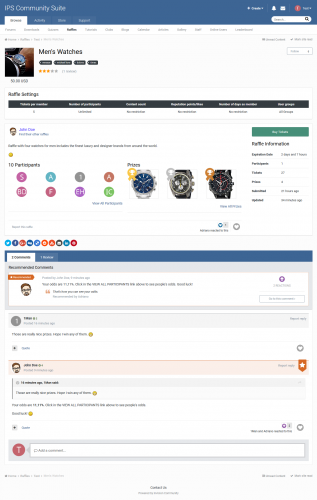 Compatibility: IPS 4.3 and 4.2 only! Requirement: Commerce: https://invisionpower.com/features/commerce THIS IS NOT AN UPGRADE of the old app (for IP.Board 3), so if you used the old app you probably still have data from the old app in your database, take a read on Manual.pdf in the zip file or request support BEFORE you install this app. Each purchase entitles you to use Raffles System on one Community installation. Be aware that may have local laws regarding paying for the tickets unless you are registered as a non-profit organization, or have special authorization to do so. Some sites like Paypal usually shut accounts down or even can take actions against the accounts of people using their site in that manner. Features:
