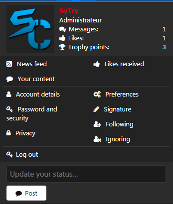 Additional requirements: account_wrapper [SC] Account Wrapper - Font Awesome I wanted to do a tutorial but it was very long : that's why I made an extension ! This extension is small because it only applies template modifications : Installation : Download and unzip it. Copy the src/addons/SyTryC/AccountWrapperFA directory to your server. From the AdminCP install the add-on. Screen : If you want the template modifications as a tutorial, just tell me. If you have question, ask me !