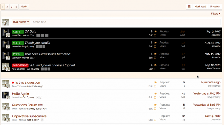 This will give you a prefix menu above the thread list which filters threads by prefix. (Much more obvious and intuitive than the existing Filter by prefix)Here's one I made earlier: Filter Prefix Menu small.mp4 - XenForo community.MP4 You can do this via a template modification or just customise the template itself. Make a note of the prefix names and IDs (you can see the ID number in the URL of the main Thread Prefixes list - click on the prefix and note the number at the end. Alternatively click on the prefix in the thread list. Make a note of the forum URL when NOT filtered by any prefix. This is for the initial All menu item to quickly get back to unfiltered. Make a note of the forum ID (the number at the end of the forum URL) Add the code below to the top of the template forum_view (capitalised text to be replaced, they are instructions what to insert in the code) First we need to make sure this only appears in the forum we want (you can do this for as many forums as you want). In this case the forum ID is 68Step A: <div style="margin-bottom:10px"> <xf:if is="{$forum.node_id} == 68"> <span class="">Filter by Prefix:</span> <a href="INSERT FORUM URL HERE"> <span class="label label--red">All</span></a> CODE FOR STEP B WILL BE INSERTED HERE </xf:if> </div> Then we add the different prefixes as menu items. Obviously you can choose your preference of color. Insert the step B code into the aboveStep B: <a class="labelLink" href="?prefix_id=1"> <span class="label label--red">Name of Prefix 1</span></a> <a class="labelLink" href="?prefix_id=2"> <span class="label label--red">Name of Prefix 2</span></a> <a class="labelLink" href="?prefix_id=3"> <span class="label label--red">Name of Prefix 3</span></a> ADD AS MANY PREFIXES AS YOU HAVE FOR THAT FORUM You can obviously style your div (e.g. add a class to extra.less) or <span>Filter by Prefix:</span> span to suit