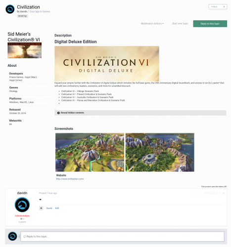 Users can add steam games to topics. After attaching a game, which can be done easily using a search with auto complete, the thread will show various information about it above the post.